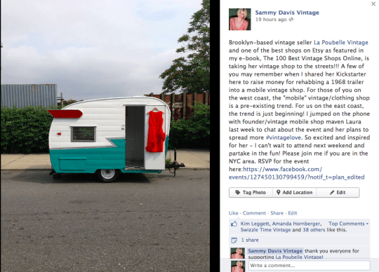 >> Ask questions. Facebook is where conversations blossom fastest, thanks to how Facebook has structured the commenting system with “replies” and posts that can live in people’s popular newsfeeds for days. Ask questions which spur conversation – even if unrelated to vintage. Getting personal can connect you to a following who grow more loyal the more they get to know you.