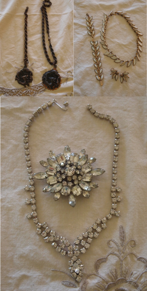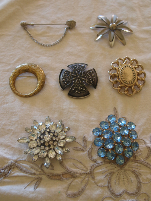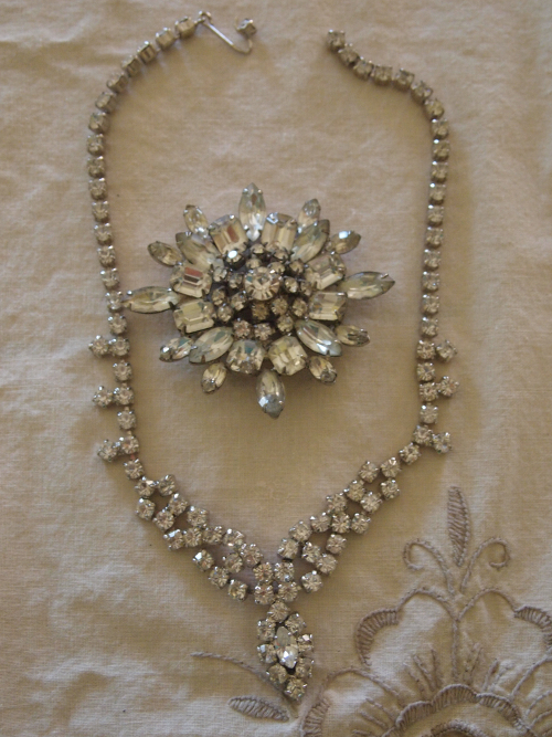 I love the rhinestone pins and brooches. I have some of my late mother in law’s jewelry, some of it handed down to her from HER mother and grandmother, so some of the pieces are definitely antique. All lovely, all tell a story to me.