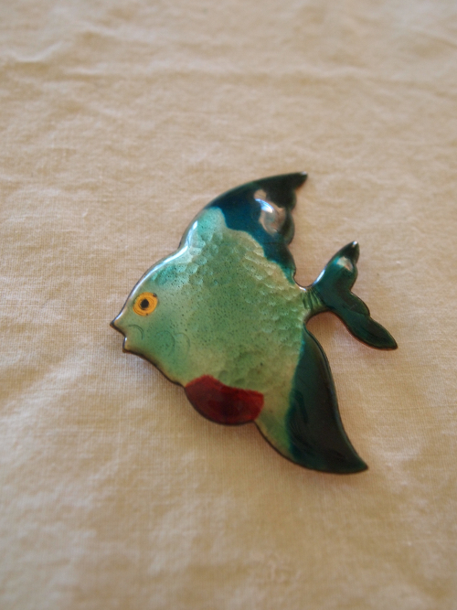 HOW TO WEAR IT: The fish pin’s dark colors would swim well along the style of a light colored blazer. Pin the fish on your collar or the top of a breast pocket.