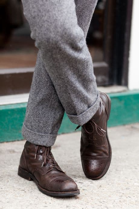 Feelin’ the 1930s? If you’re already tall, go for a pant with a high-waist and a wide leg. Your legs will resemble the tall and girthy columns holding the Roman Coliseum. Flatter yourself, you manly giant, you! Try a herringbone pattern!