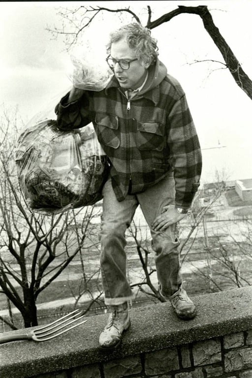Burlington Mayor Bernie Sanders picks up trash on his own in a public park after being elected in 1981, his first electoral victory