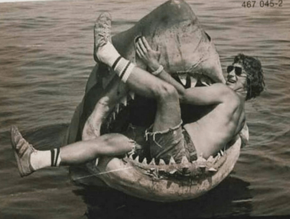 Steven Spielberg in the mouth of the mechanical shark filming JAWS in 1975