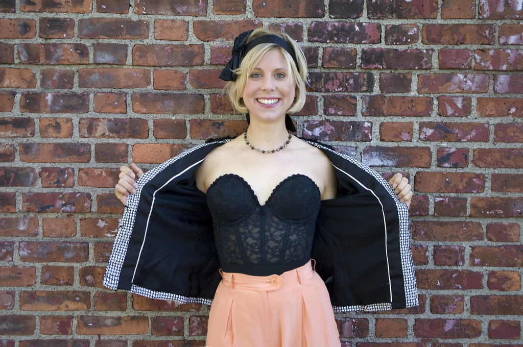 How adorable! I love how you paired the sexy bustier with a tailored pant. It is totally appropriate as outerwear like this. Oh, and I love the color of those pants. I’ve really been drawn to that light peachy orange lately. It reminds me of sherbet or something. :)