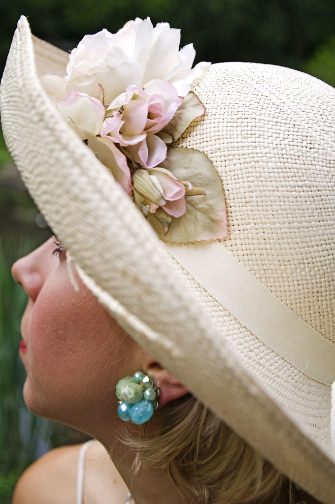 Vintage straw hat with an extra wide brim, sash and faux flowers.