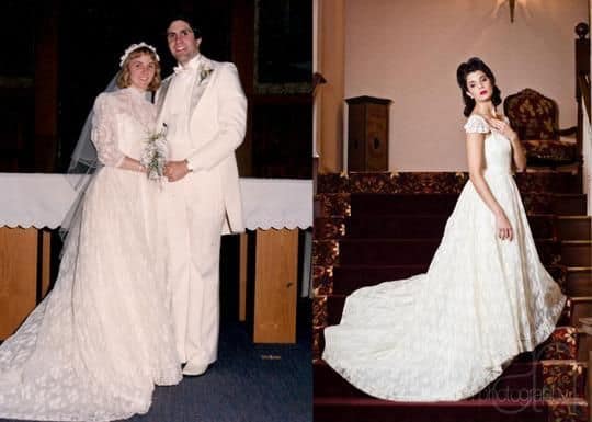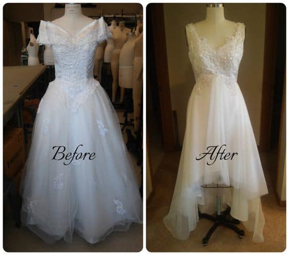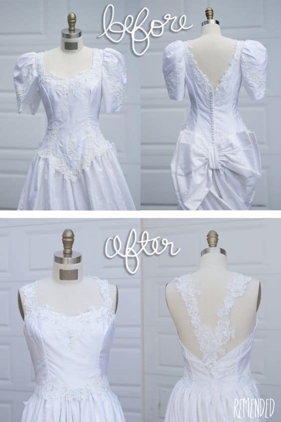 Illusion necklines are gorgeous, but this one was a little dated. Agreed? Re-cut the neckline and cap the sleeves for a refreshing twist on your mom’s wedding gown. You might even feel inclined to raise and taper the hem so that it has an adorable high- low effect. These slight alterations can really give your dress the character and charm that you’re looking for.