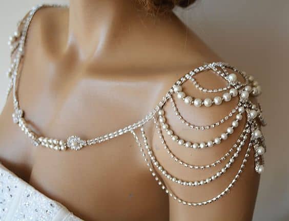Using jewelry to adorn your shoulders in your sleeveless thrifted dress will give you a sweet bohemian look. You can attach pearls, crystals and rhinestones to your dress or wear them as a separate accessory if you’ve decided you’re not particularly interested in wearing a necklace on your special day!