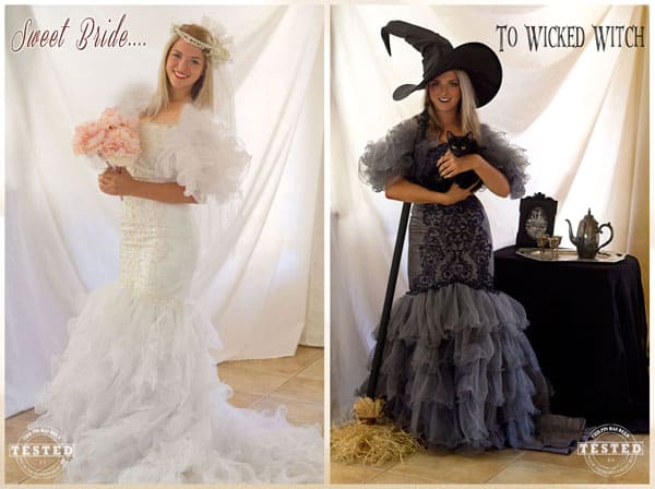 So maybe you’re not getting married and have a brilliant idea of dying a wedding dress black and wearing it as a witch’s costume? Or maybe you have fairy-tale princesses in mind? When you’re out thrift shopping for the perfect costume, a wedding dress just may have that dramatic design you’re looking for!