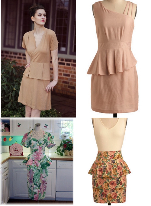 STYLE NOTES: The peplum dress has a double-layered skirt — the “peplum” itself is an overskirt of extra fabric to the skirt itself. There are two kinds of peplum overskirts: “fitted” (see left image, above) and “flared” (see left image, below).