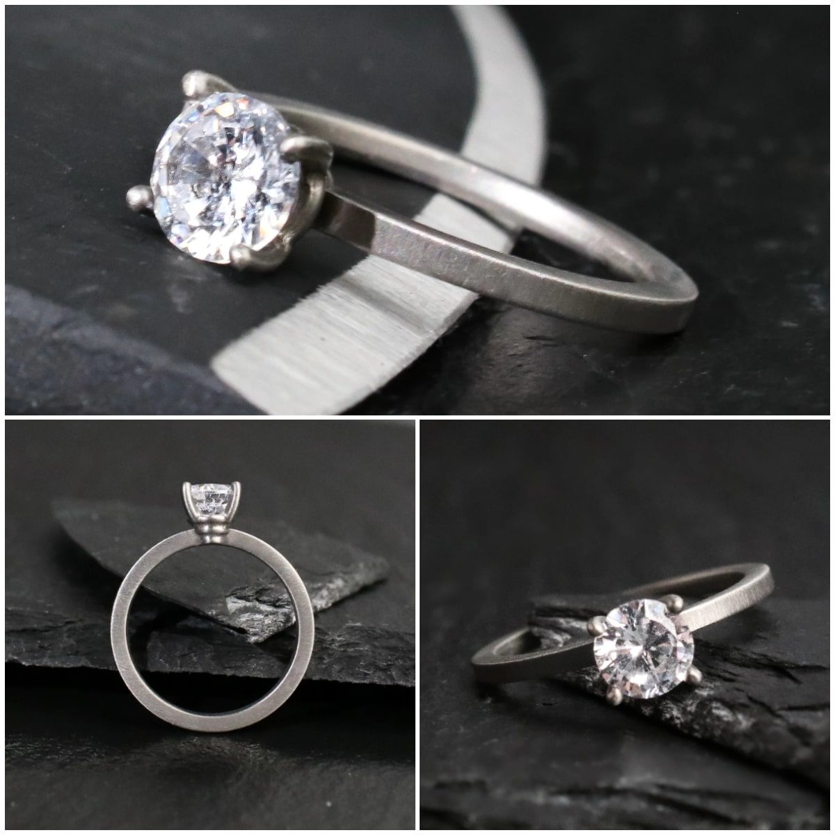 The Athena was named for the ancient Greek goddess of wisdom. Decked out in full hoplite panoply, she stood as patron of the famous city of Athens, having won the position by gifting its inhabitants the olive tree. For comparison, her opponent Poseidon gave them a saltwater spring, which didn’t quite elicit the shouts of joy that he expected. Regardless, this ring has the simple but nonetheless beautiful elegance that one would expect from grey-eyed Athena. Its band is soft-brushed titanium, a material that will stand the test of time better than any precious metal. Meanwhile, its stone is cubic zirconia, which shines as pleasantly as any diamond but is much more ethical and eco-conscious.