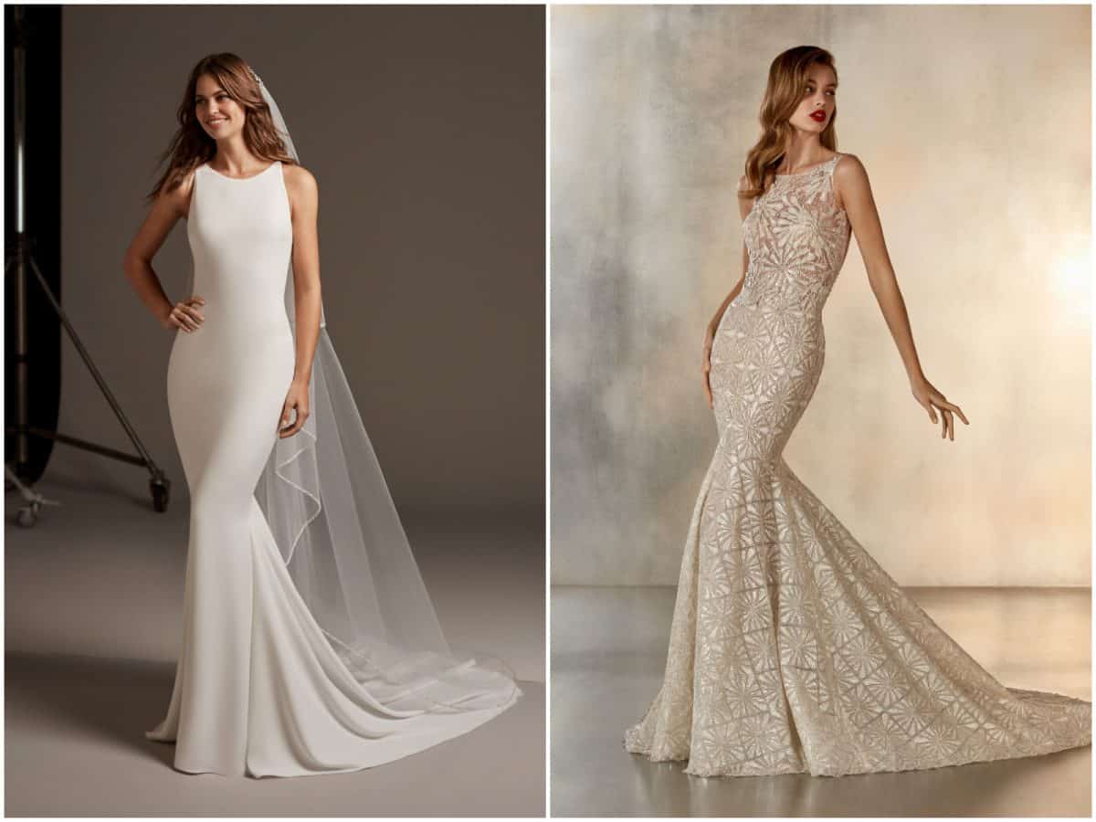 The first thing I’d say is to find a mermaid wedding dress. I think they are perfect for a vintage look, for example this beautiful dress from Pronovias US is perfect! You can tone down the detail and opt for simple v-neck wedding dresses with a medium sized tail.