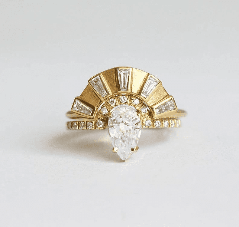 When it comes to art deco rings from that era, there is one word that can describe it, and it’s – bold. It looked nothing like what we were used to before. Art deco defined rings and other jewelry in geometrical shapes such as triangles, rectangles, squares and circles with stones such as jade, corals and pearls. In addition to yellow gold and silver, a new metal appeared which is platinum.
