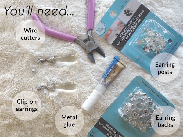 Use wire-cutters to remove the “clip-on” and squeeze that magical industrial strength super glue to new earring posts. Center the posts on the back of those beauties and show off your (most likely) one-of-a-kind vintage jewelry.