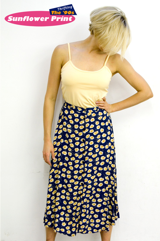 THE TREND: The sunflower design trend was one of many print trends to come out of the ’90s, along with daisy floral, ’60s inspired colorblock and dirty grunge plaid. Sweet and innocent seeming, the sunflower print was fitting for the grunge girl who wanted to pair it with a tattered long sleeve denim shirt and utilitarian combat boots for an ironically rebellious fashion statement. But sunflowers were marketed to the mainstream market too, and designers tacked them onto just about every item of clothing imaginable from maxi skirts (like the one I thrifted above) to jumpers, tops, shorts, bags, accessories and hats (with oversized sunflower appliques a la ’90s fashion icon Blossom).