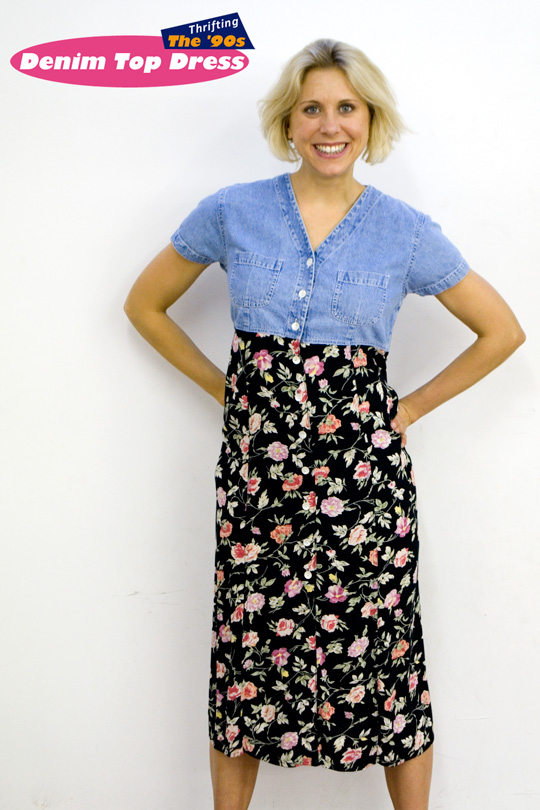 THE TREND: Dresses separated by a denim bodice-top and patterned skirt was a trend completely original to the ’90s. This dress style was like wearing a denim shirt and skirt in one, almost like the popular shirtwaist dresses of the 1950s were a button-up collared shirt and A-line flared skirt combined. The convenience of the denim shirt attached to a skirt seemed like a good idea but after witnessing its execution, isn’t as attractive to 2012 tastes. Perhaps we’ll see this style of dress make a future comeback in reverse — floral printed tops attached to denim skirts, anyone?